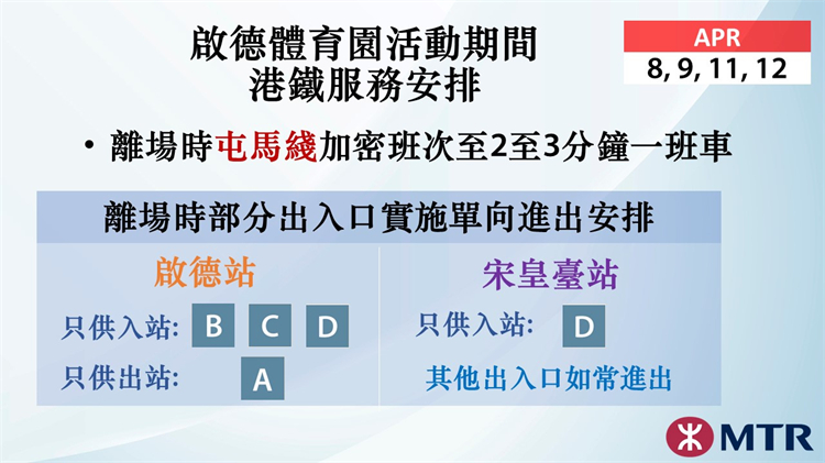 港鐵指出,因演唱會入場時間為黃昏繁忙時間,屯馬線車站可能比較繁忙,希望乘客合作及體諒。至於在觀衆離場時,啟德及宋皇臺站會實施出入口單向進出的特別安排,如人數眾多或需分批入站,會提醒乘客預留額外等候時間,啟德及宋皇臺站會增加職員協助乘客,亦會有乘客廣播及標示指引乘客。