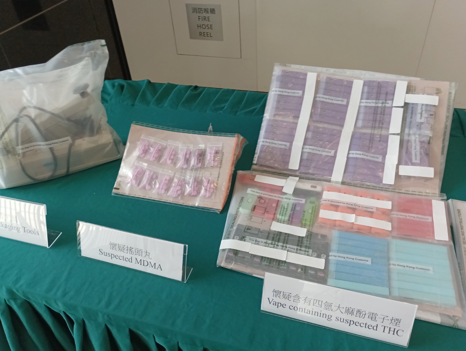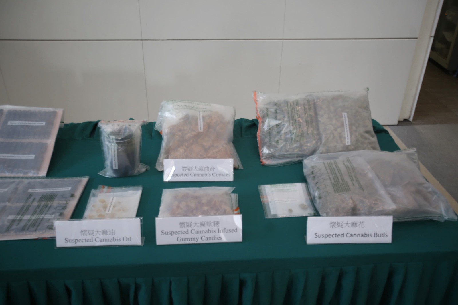 海關毒品調查科毒品調查第三組高級調查主任姚文顥今日(8日)表示,根據情報人員昨日在大埔區進行反毒品行動,期間在沙埔仔村截查一名目標男子,在其身上搜出2克懷疑大麻花,隨即將其拘捕,其後將疑犯押解到附近一個村屋單位搜查,發現約3.3公斤懷疑大麻花、約1.7公斤懷疑大麻曲奇、約900克懷疑大麻軟糖、約700克懷疑大麻油、515粒懷疑大麻油煙彈、約100枝懷疑含有四氫大麻酚的電子煙、120粒搖頭丸和一批毒品包裝工具,市值約100萬元,估計毒品供應新界區的用家。