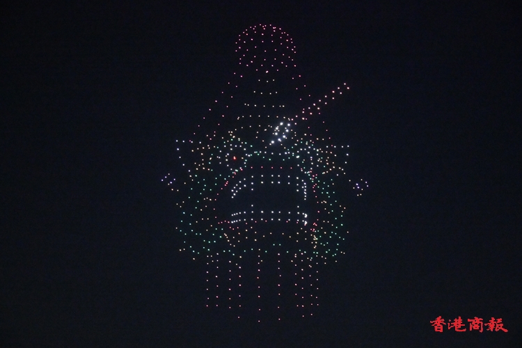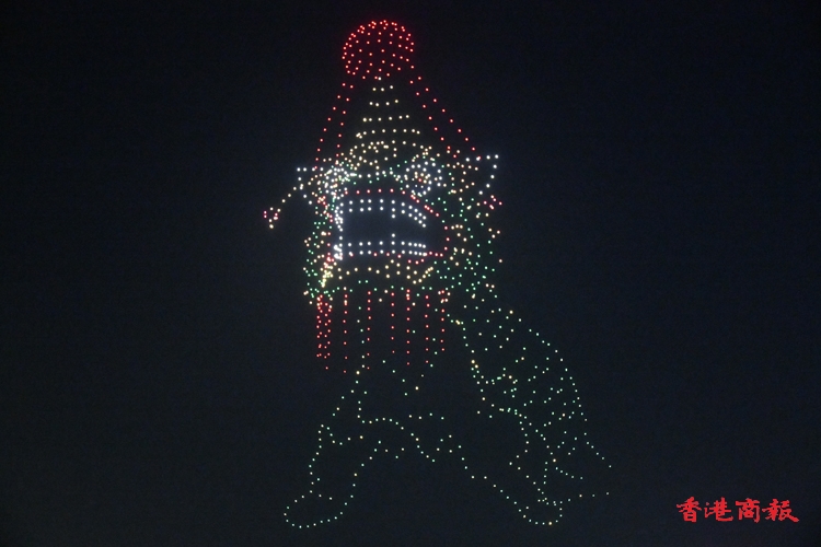 「譚公誕—瑞獸麒麟舞動」環節中,就以譚公誕為背景,瑞獸麒麟象徵吉祥與平安。無人機呈現「麒麟」點睛後,幻化成七彩麒麟躍上夜空,為節慶增添熱鬧與喜慶的氛圍。