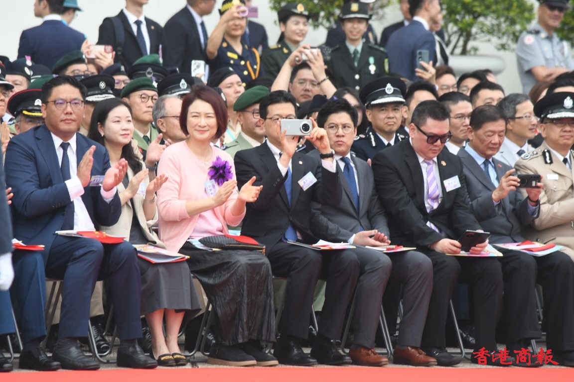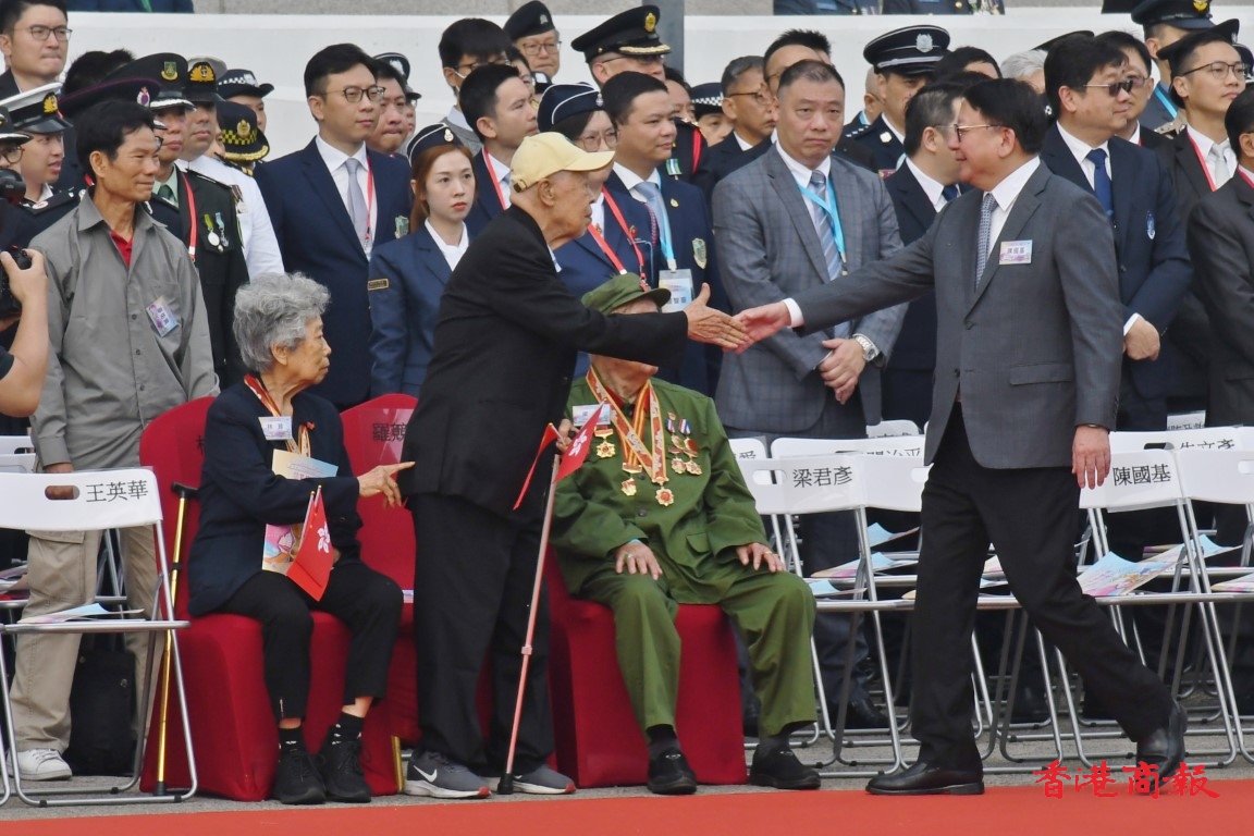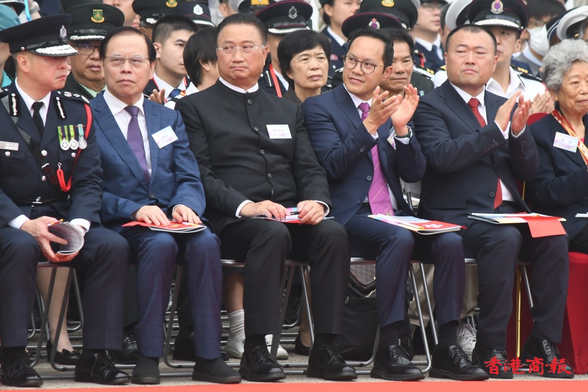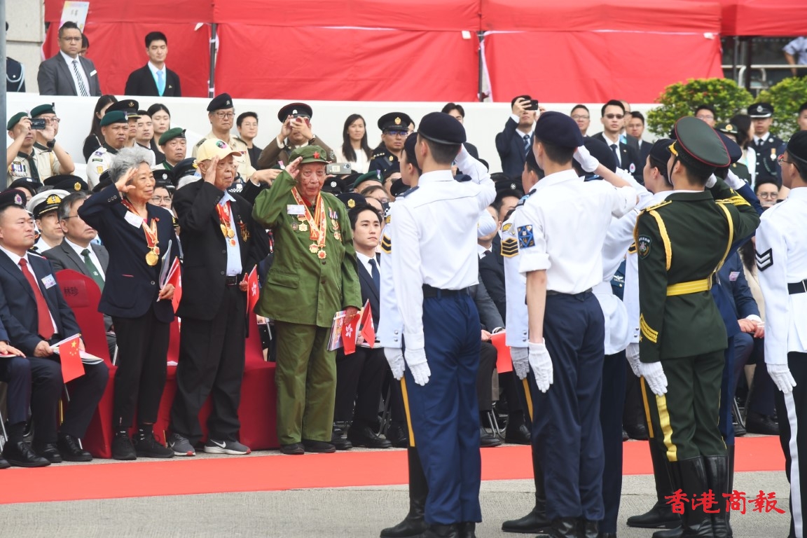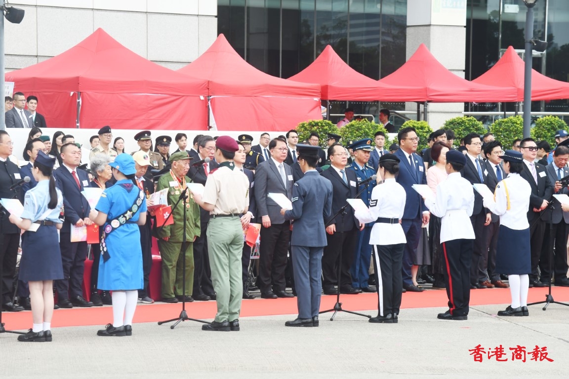 政務司司長陳國基、民政及青年事務局副局長梁宏正、中聯辦副主任劉光源、外交部駐港特派員公署副特派員潘雲東、前特首梁振英與太太梁唐青儀、全國人大常委會委員李慧琼、立法會主席梁君彥,以及多名行會成員、立法會議員出席;3名東江縱隊香港地區抗日遊擊隊老戰士亦到場觀禮,有1200名青少年制服團隊及中小學生參與活動。
