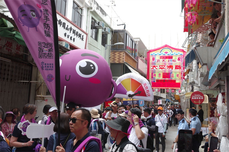 水警海港區警民關係組、水警總區防止罪案辦公室及網絡安全及科技罪案調查科攜手合作,聯同少年警訊及耆樂警訊昨日(5日)在「長洲太平清醮會景巡遊」期間,結合傳統「飄色巡遊」文化與「提防騙子」主題,舉辦防騙宣傳活動。主題為 「飄色同行,提防騙子」,巨型「提子」與「防騙視伏器」在巡遊中向市民傳遞防騙訊息,共同提升防騙智慧。讓參觀人士在欣賞文化活動同時,亦可提升警覺性,遠離詐騙陷阱。(記者 區天海)