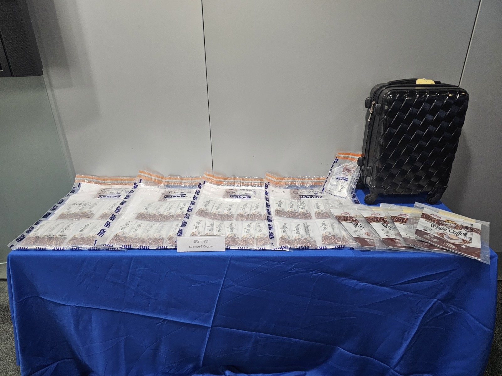 警方毒品調查科行動組高級督察何灝庭今日(19日)表示,昨日晚上探員在機場入境大堂截查一名從馬來西亞抵港的外籍女子,在海關人員協助下搜查其行李,搜出4包、共重3.35公斤的懷疑可卡因,以咖啡粉包裝袋作掩飾,市值約270萬元,隨即被探員拘捕。調查得知有人在外地被販毒集團招攬,被金錢利誘以遊客身份掩飾運毒到港。被捕外籍女子23歲,報稱是一名翻譯員,現正被扣留調查,將會被暫控「販運危險藥物」罪,明日(21日)在西九龍裁判法院提堂。