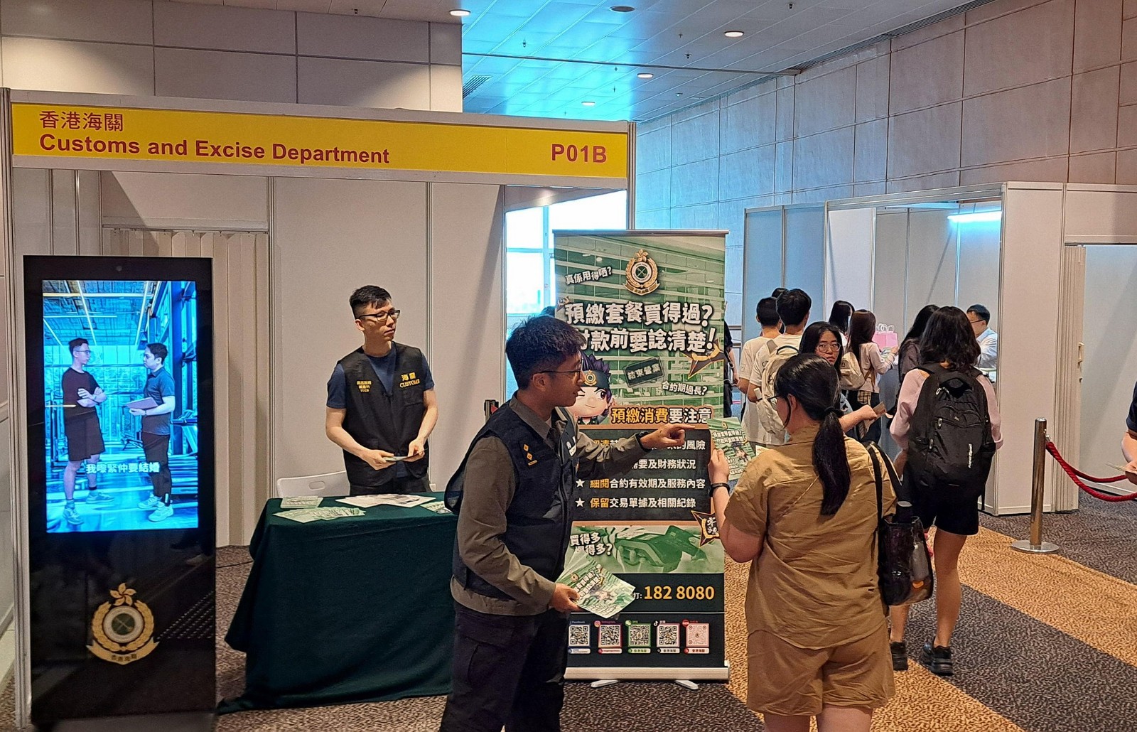 海關宣傳隊人員於7月11至13日,到會展中心「香港婚紗展暨世界結婚巡禮2025、香港婚宴展暨結婚用品博覽2025」,向市民派發宣傳單張,提醒消費者購買預繳套餐時要小心謹慎。
