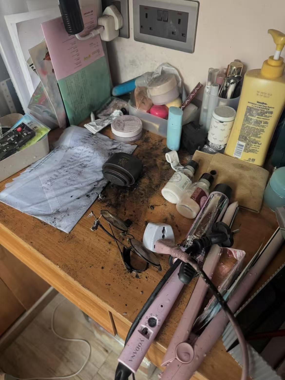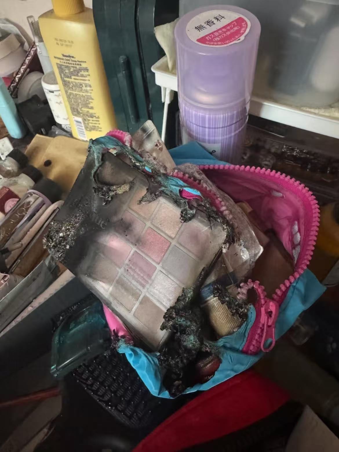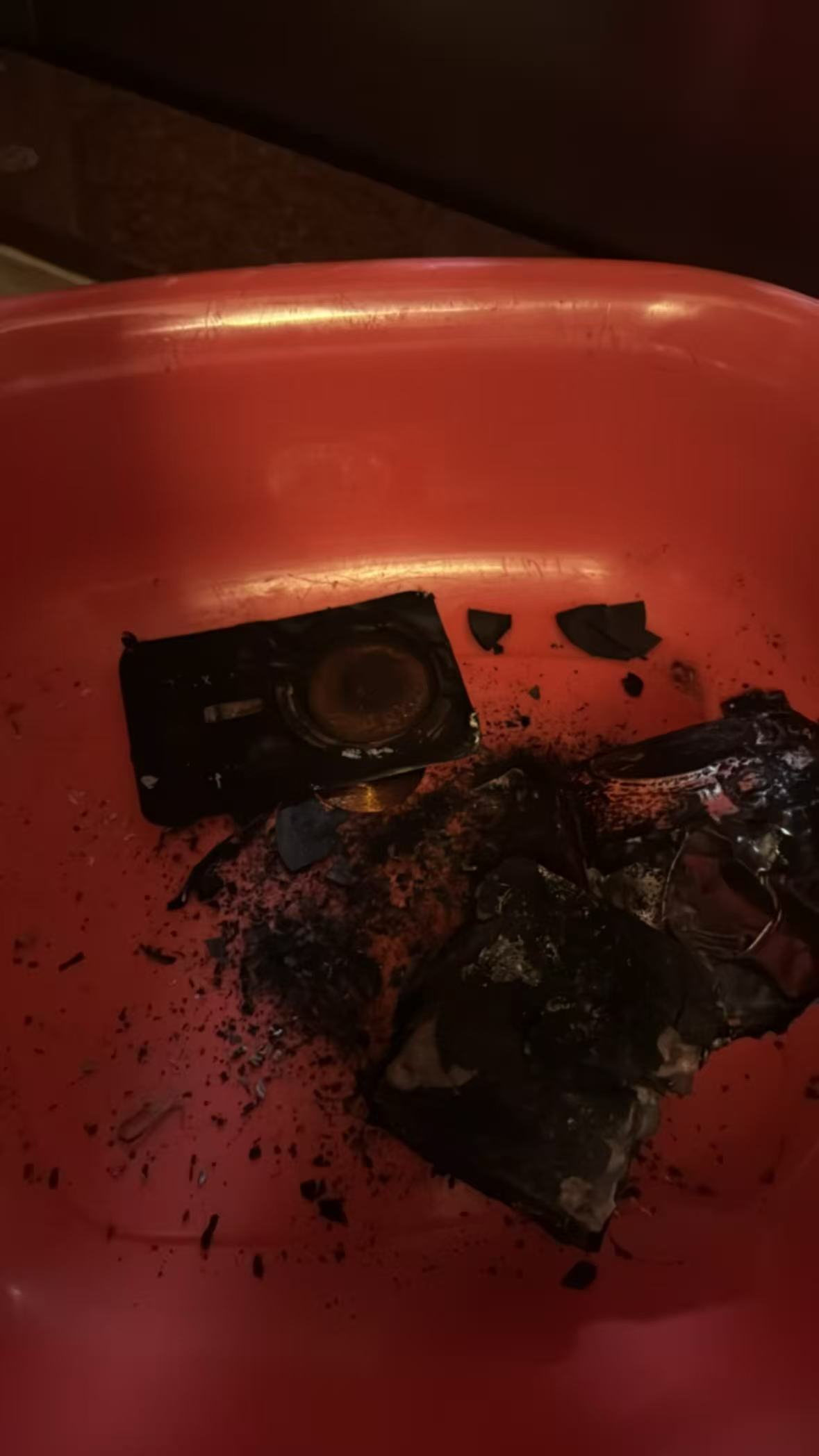 從相片可見,涉事「尿袋」爆炸起火後外殼燒至焦黑,波及桌上物品。(社交平台Threads圖片)