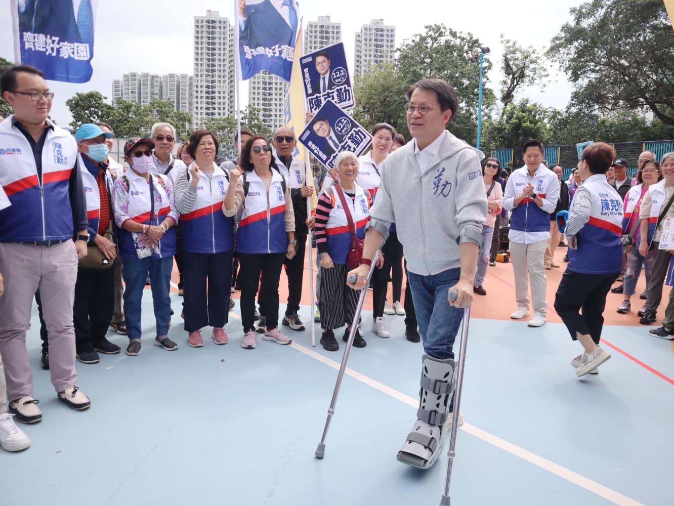 陳克勤負傷出席集氣大會。(記者 馮瀚文攝)