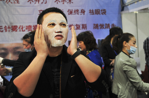 4月2日,在济南举办的国际美容化妆品产业博览会上,一男子当众贴面膜秀“体面”,推广男人“面子工程”。