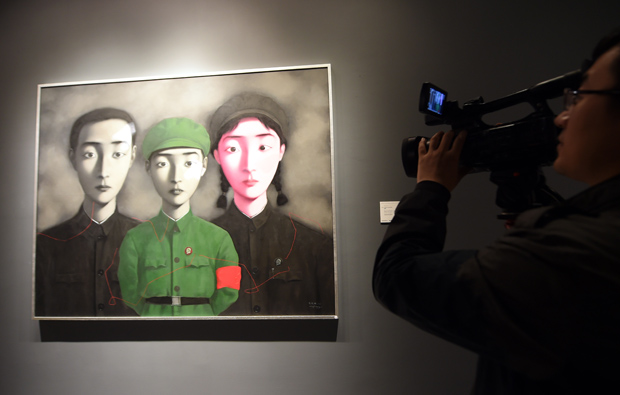 香港苏富比2014春拍拉开序幕。 4月2日,香港苏富比2014春拍特展在香港会展中心举行,50件“现当代亚洲艺术品”展出,总估价超过4亿港元。其中张晓刚的《血缘:大家庭3号》估价6500万港元以上;该作品是整个《血缘》系列中唯一一幅以毛泽东徽章、红色臂章及绿色革命服的小红卫兵为画面中心的作品。“现当代亚洲艺术晚间拍卖”将于4月5日举行。