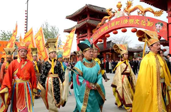 当日,河南省开封市举行“清明踏春大巡游”活动。上千名演员和游客、市民们一起身着宋代服饰,在市内大街进行巡游。