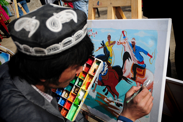 新疆莎车县农民画朴实活泼。 4月3日拍摄于新疆喀什地区莎车县,一位农民画家正在作画。据介绍,当地的农民画朴实、生动、大胆、抒情、俏皮,题材有南疆风光、维吾尔传统文化、劳动场面、节日庆典等等。莎车县农民画曾先后在广州、上海、武汉等地举办展览,取得了意想不到的效果,好多作品当场被买走。