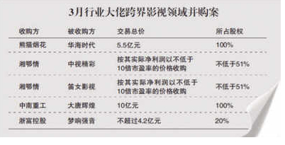 即使只是近来文化传媒产业并购大潮中的“小浪花”,也是规模动辄数十亿资本,带动股指整体拉升。4月2日,已停牌3个月的华录百纳披露,公司计划以25亿元的价格,收购广东百合蓝色火焰文化传媒股份有限公司100%股权,公告后接连涨停。4月1日,酷6传媒在经历总裁离职、高管变动频繁后,通过投向科技人雷军、许东旭的“怀抱”,在美股市场连连暴涨。全产业链甚至跨产业布局,正让文化传媒产业“圈地运动”此起彼伏,带来巨大机遇和风险。