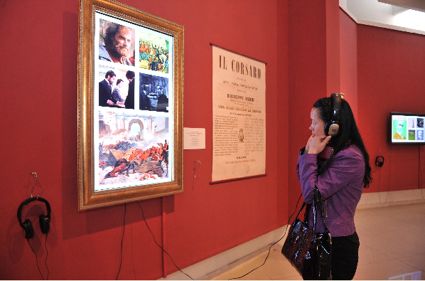 4月8日,为纪念意大利着名歌剧作曲家朱塞佩·威尔第诞辰200周年,名为“创造真实”的威尔第图象资料中国巡展重庆站在四川美术学院美术馆开幕。此次展览包含21幅特殊“画像”─21个图象视频将以带框画像的形式呈现,播放威尔第的主要作品。观众可以通过耳机欣赏到威尔第的音乐作品,真切感受威尔第通过音乐表达出的人类情感。图为参加开幕式的嘉宾欣赏威尔第的图象视频作品。