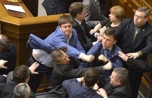 在乌克兰政局动荡、克里米亚加入俄罗斯之后,乌克兰议会的混乱令人大跌眼镜。当地时间4月8日,乌克兰自由党议员与共产党议员在国会期间大打出手,议员们挥拳猛击如见杀父仇人。