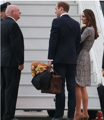 威廉王子手中拿着乔治王子的袋鼠背包