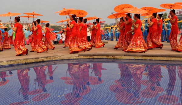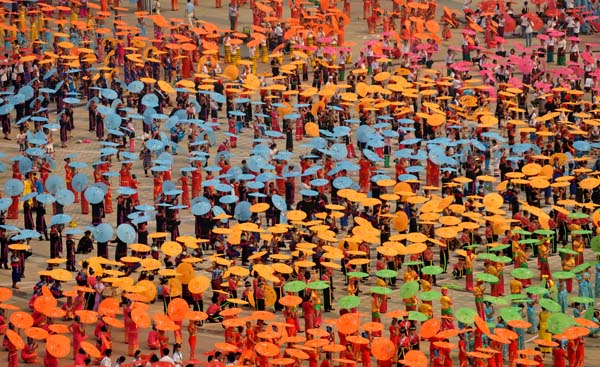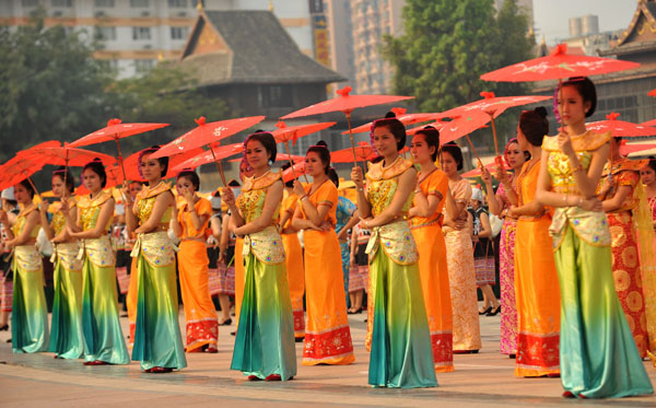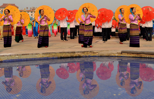 当日,随着铿锵有力的铓锣声、鼓点声,云南省西双版纳傣族自治州10580名群众身着节日盛装,在景洪市泼水广场上舞动花伞,翩翩起舞。伞舞是傣族传统舞蹈之一,每当傣族泼水节、上新房等喜庆日子来临时,傣家人都要跳起伞舞,场面壮观。