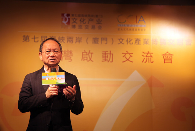 4月15日,第七届海峡两岸(厦门)文化产业博览交易会台湾启动交流会在台北举行。图为台湾亚太文化创意产业协会理事长陈立恒在会上致辞。