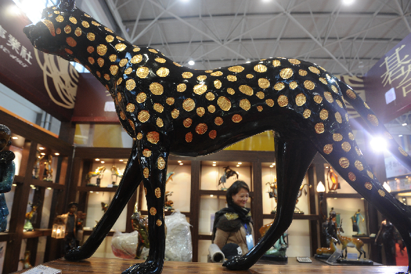 4月30日,参观者在参观展出的台湾铜雕。