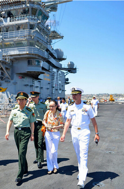 解放军总参谋长房峰辉登上美国海军尼米兹级航母里根号,参观飞行甲板。