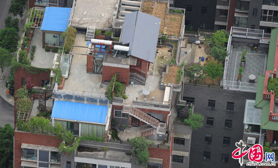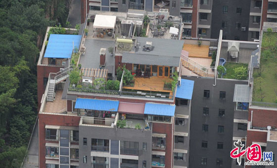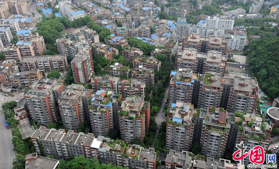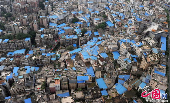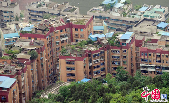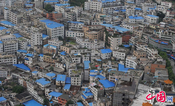 2014年5月14日,贵阳市云岩区东面许多楼房最近都被加了“铁皮帽子”。这些密集的楼房中,大多数是七八层楼,看不出规划与秩序,这些密密麻麻的楼房最高一层用板房的铁皮盖着,从高处望去成了城市上空的棚户区。