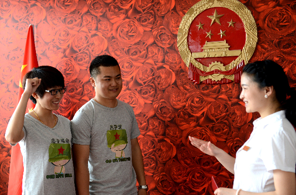 5月20日,在合肥市蜀山区民政局婚姻登记处,一对新人在宣誓。