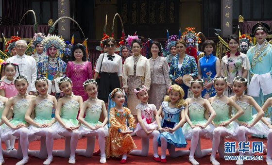 5月21日,国家主席习近平夫人彭丽媛邀请出席亚信上海峰会的部分国家领导人夫人共同观看中国非物质文化遗产展示和文艺演出。上午,柬埔寨首相夫人文拉妮、吉尔吉斯斯坦总统夫人阿坦巴耶娃、阿塞拜疆总统夫人阿利耶娃、哈萨克斯坦总统女儿纳扎尔巴耶娃抵达豫园,受到彭丽媛热情欢迎。这是彭丽媛同来宾观看文艺演出后与演员合影。 新华社记者黄敬文摄