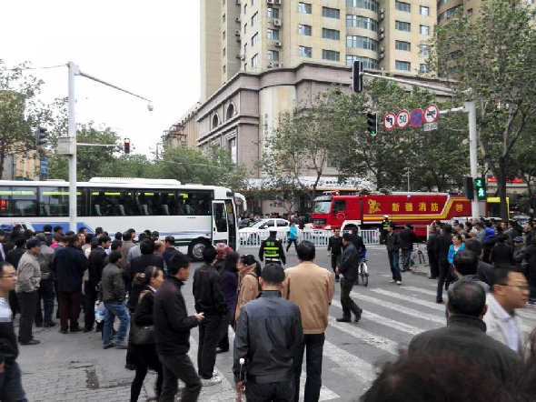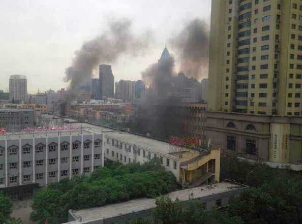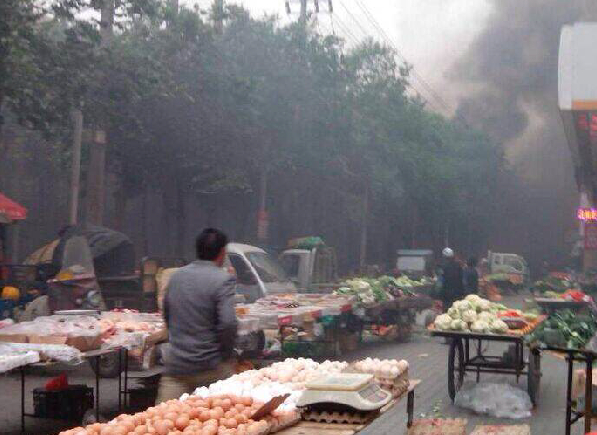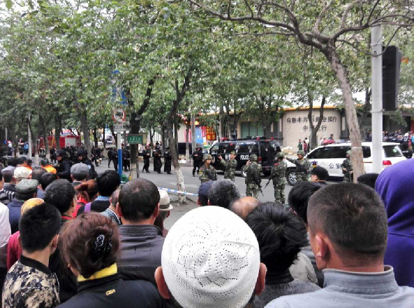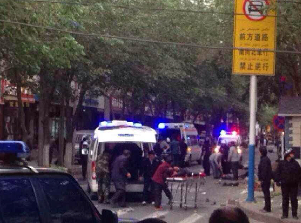 北京时间22日早晨7时50分,乌鲁木齐市沙依巴克区公园北街早市发生一起爆炸案,造成人员伤亡。受伤人员当前已送往临近医院接受救治。(手机拍摄)