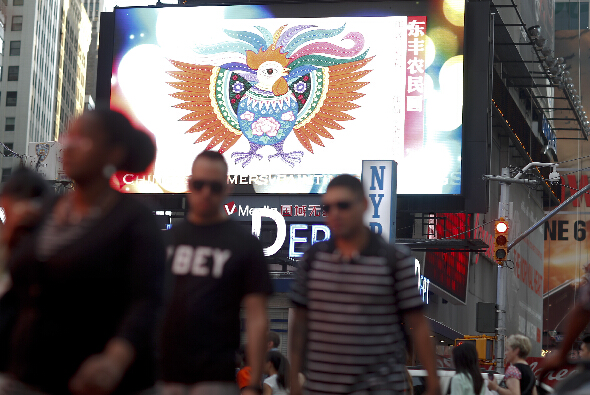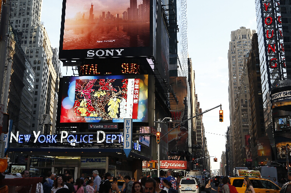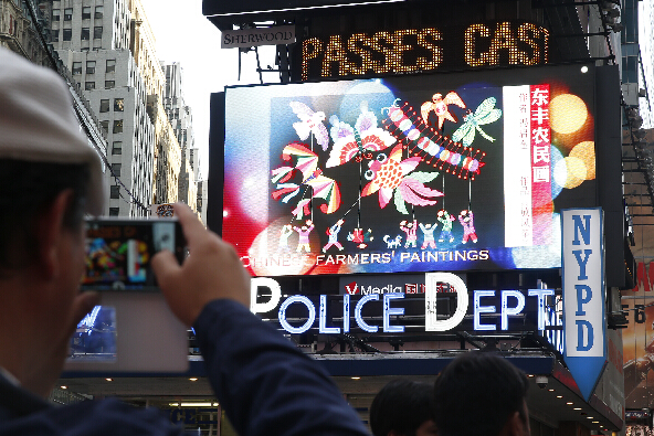 当地时间5月25日,以“世界情·中国梦”为主题的“中国农民画精品暨东丰农民画赴联合国总部大展”的宣传片在纽约时代广场大屏幕播出,来自中国35个农民画乡的多幅农民画精品集体亮相。这是纽约时代广场上第一次有中国农民画的图象出现,农民画鲜?的色彩以及丰富的生活图景与纽约时代广场的时尚摩登交相辉映。本次大展于5月21日至23日在纽约联合国总部大厦举行。