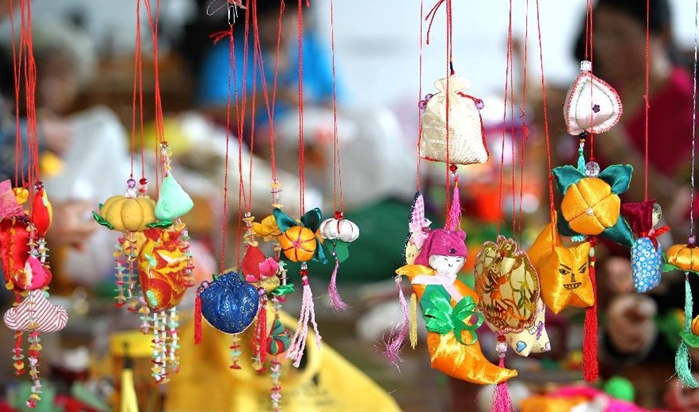 (1)5月21日,一名选手在拍摄做好的香囊。