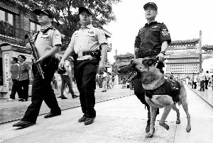昨天,民警在前门等繁华地区带犬巡逻。首席摄影记者 吴宁/摄