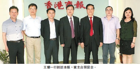 【香港商報訊】記者李摯報道:河南省委宣傳部常務副部長王耀(中)一行昨日到訪本報,受到香港商報高級顧問、全球商報聯盟理事長陳錫添(右三)等熱情接待,雙方就河南來港招商等話題親切交談。