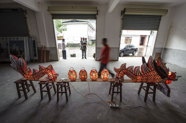 6月7日拍摄的在彭坊村村委会展示的当地非物质文化遗产代表作──刻纸龙灯。