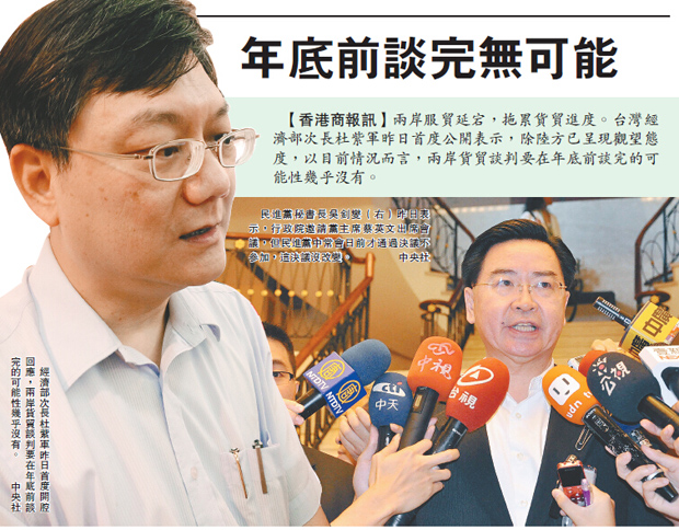 【香港商报讯】两岸服贸延宕,拖累货贸进度。台湾经济部次长杜紫军昨日首度公开表示,除陆方已呈现观望态度,以目前情况而言,两岸货贸谈判要在年底前谈完的可能性几乎没有。