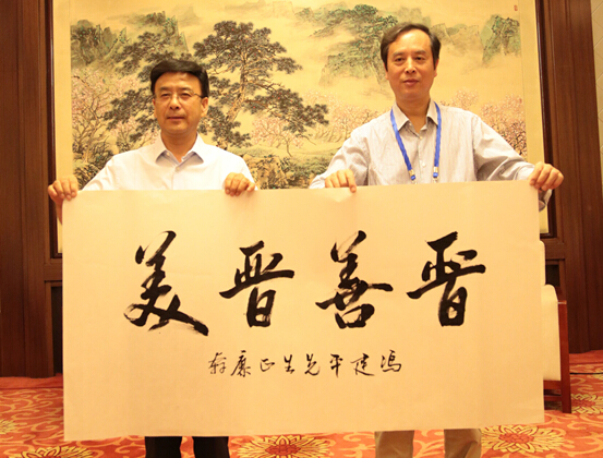 中国作协副主席廖奔现场题写“晋善晋美”四个大字,左为山西省旅游局局长冯建平