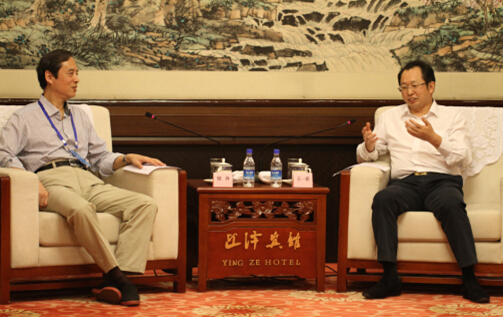 山西省副省长王一新向中国著名作家采风团团长、中国作协副主席廖奔介绍山西历史文化。