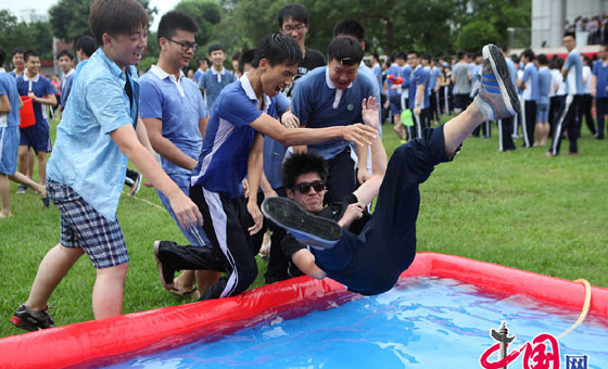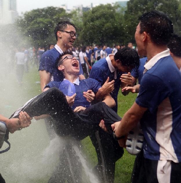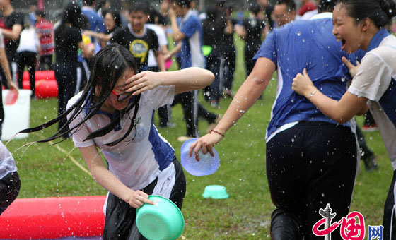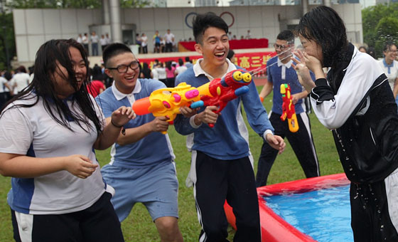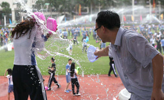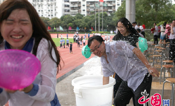 中国网6月11日讯 2014年6月10日,深圳市福田中学举行高三毕业典礼与泼水节,在进行了简单的毕业典礼后,校长一声令下,主席台上的老师、操场上的学生开始互相泼水。位于主席台的福田中学校长郭其俊也被数名学生围着泼水。操场上的“战场”更加疯狂,不少学生把自己的班主任扔进了水池,老师也不甘落后,纷纷拿起脸盆朝学生反击。福田中学举办泼水节的宗旨是以水为媒介,进一步拉近师生、生生之间的距离,密切师生、生生之间的友谊,也为高三毕业的同学留下快乐的回忆。(麻友同学/东方IC)
