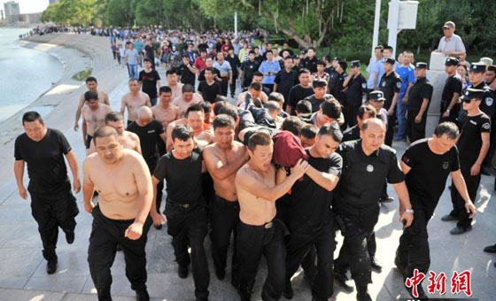 图为民警将西尔艾力·艾比的遗体高高举过头顶,踏着整齐的步伐,流着泪送往救护车辆,身后,数千市民一路相伴,送英雄最后一程。