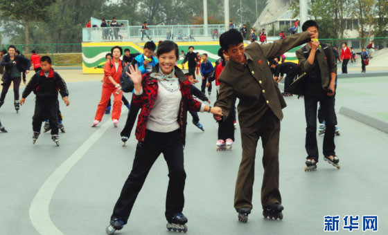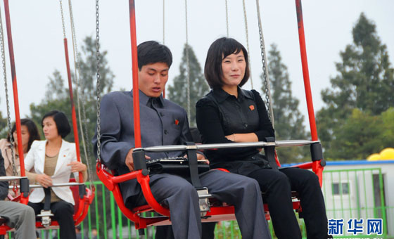 绫罗人民游乐园里的朝鲜情侣游客。新华社记者 杜白羽 摄