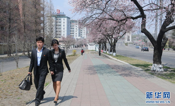 以前,大街上很少能看到公开牵手的朝鲜恋人。如今,牵手已很平常。新华社记者 杜白羽 摄