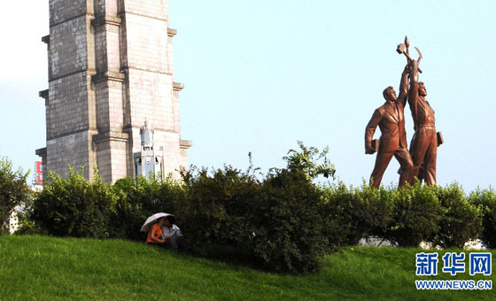 竟然在主体思想塔下,拍到了一对在树丛阳伞下亲吻的朝鲜恋人。新华社记者 杜白羽 摄