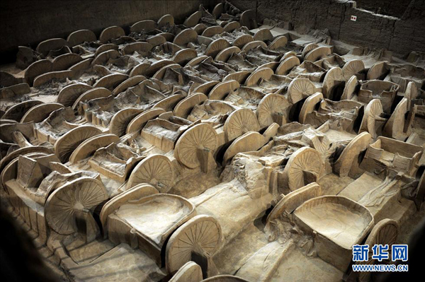 这是晋国博物馆内核心区域,“曲村——天马遗址”出土的2800多年前的车马坑(6月12日摄)。