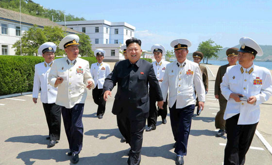 金正恩送给第730号和第748号潜艇双筒望远镜和自动步枪,同潜艇水兵一起合影留念。