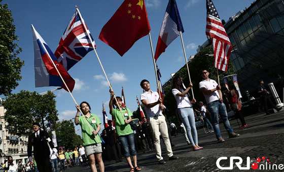 当地时间2014年6月15日,法国巴黎,香榭丽舍大街上红旗飘飘。华人共进会的发言人正在集会现场发表小型演讲,该协会是本次活动的主要组织者。图片来源:胡巍/CFP