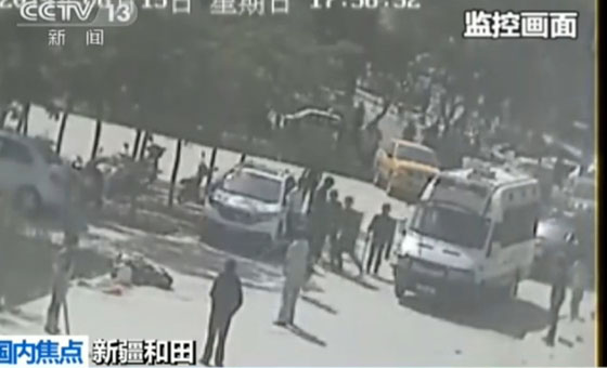 主持人:昨天下午5点45分左右,三名手持斧头的歹徒冲入了新疆和田市迎宾路的一家棋牌室,对室内的群众进行砍杀。80秒之后,他们被闻讯赶来的武装巡逻力量和群众们彻底制伏。