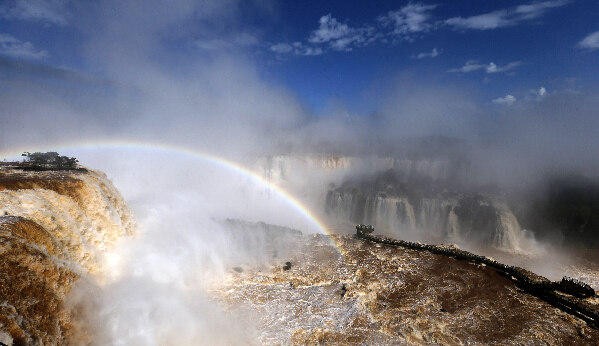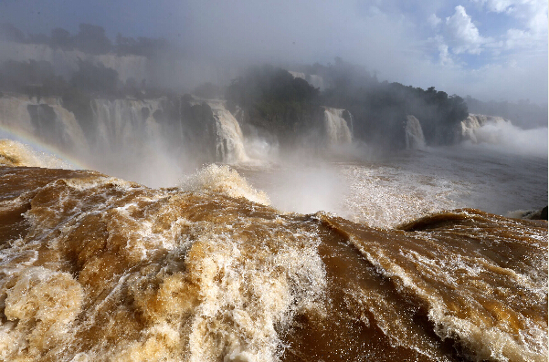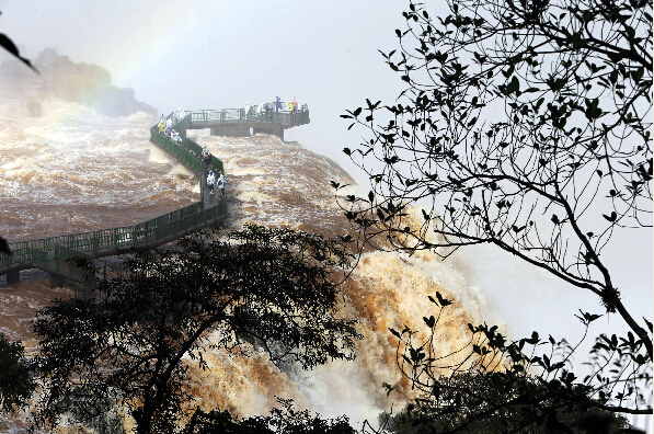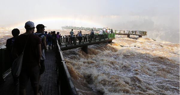 6月16日,游客在巴西南部城市福斯杜伊瓜苏附近的伊瓜苏国家公园观赏伊瓜苏大瀑布。