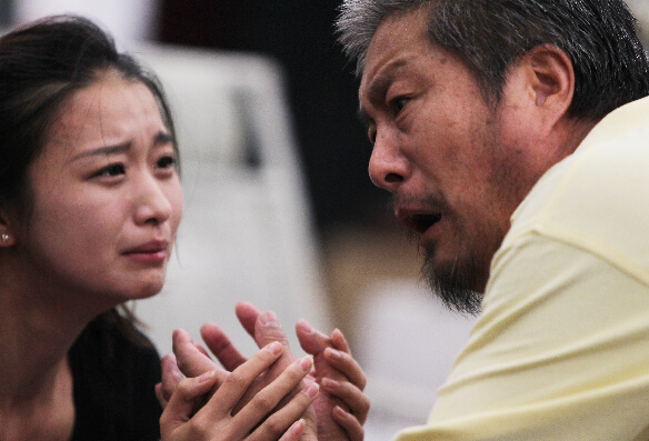6月19日,埃略特·布莱恩的扮演者王卫国(右)与三女儿考狄丽娅的扮演者翟冠华在话剧《离去》的彩排现场表演父女对白一段。