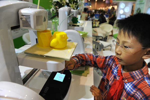 6月19日,一名小学生在展会上体验3D打印机。