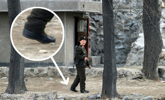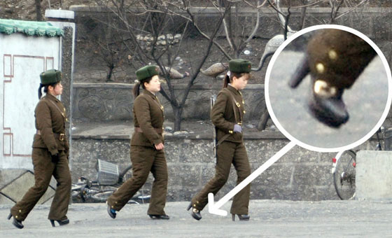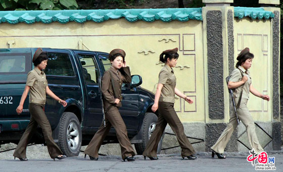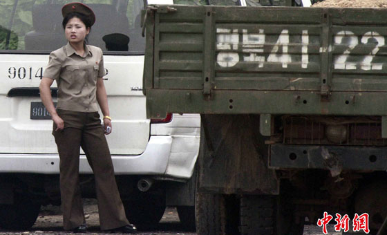 朝鲜女兵着军装背步枪巡视