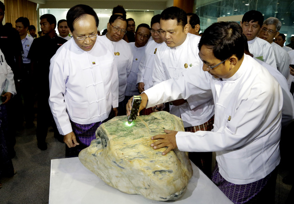6月24日,缅甸副总统赛茂康(前左)在缅甸内比都举行的第51届缅甸珠宝交易会上观察玉石。