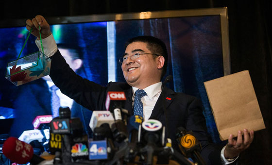 中国网6月26日讯 当地时间2014年6月25日,吵着沸沸扬扬的标哥宴请纽约流浪汉的活动终于在纽约中央公园的船坞酒店举行。一早美国各大媒体的记者就赶到现场等待陈光标的出现。而赶往赴约的纽约流浪汉们更是早早就围坐在餐桌旁。记者在场看到他们中绝大多数人穿着整齐,而餐桌上的食物看起来也诱人可口。