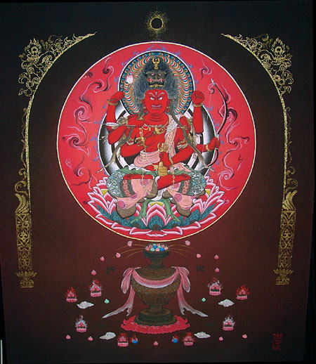 爱染明王是密教的金刚神,经典出自“金刚峰楼阁经”由古时候“佛法东传”而传入日本而成今日的“东密”,后传入台湾,密宗原较少人修持。爱染明王“全身赤红”、“炙火猛烈”呈现暴怒威猛之象,除了象征佛法精进以外,亦象征热情如火、大敬爱如烈日,其特有修法记载于 “金刚峰楼阁经”里等等。