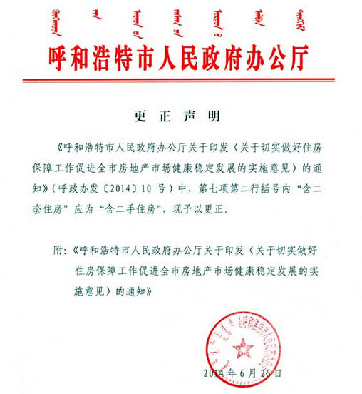 然而今日上午,当再次打开呼和浩特市房地产开发监督管理处网站时,一则发布时间显示是6月26日的更正说明出现在首页。“更正说明”称将第七项第二行括号内“含二套住房”改为“含二手住房”。